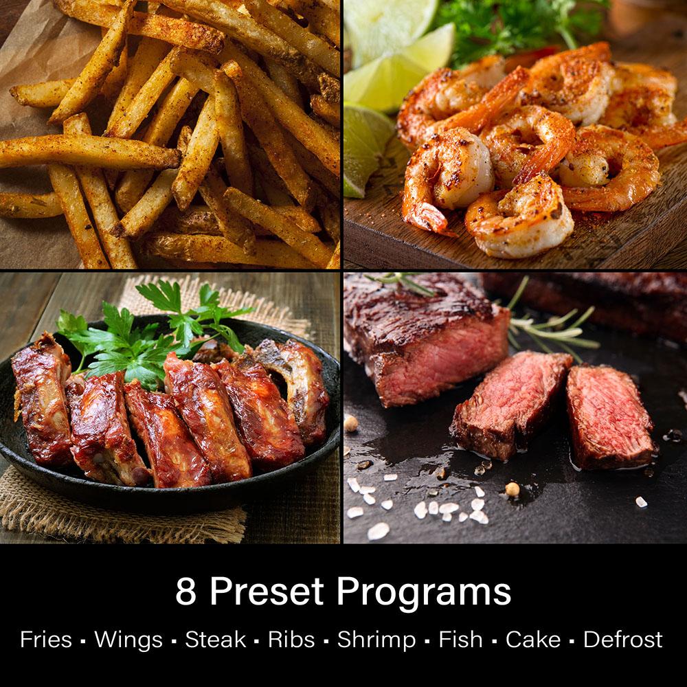 Cooking Programs: 8 (Fries, Ribs/Chops, Shrimp, Cake, Wings, Steaks, Fish, Defrost)