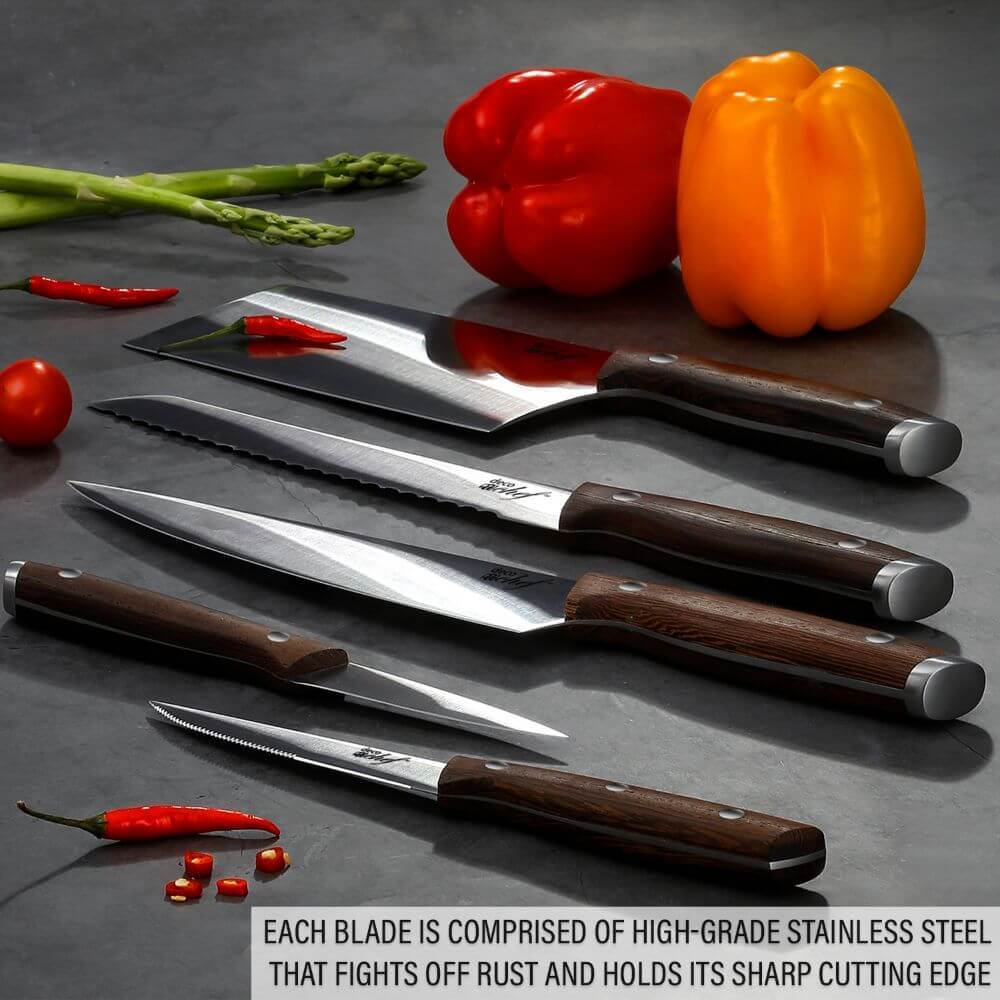 NOTE: To ensure lasting use of these stainless steel knives knives, do not soak overnight in water - this is bad practice for any knife as it may cause discoloration, rust, or other defects. We recommend using warm water and regular dish soap, avoiding the use of any caustic detergents. Once washed, it's best practice to dry immediately - never place a wet knife into its storage block.