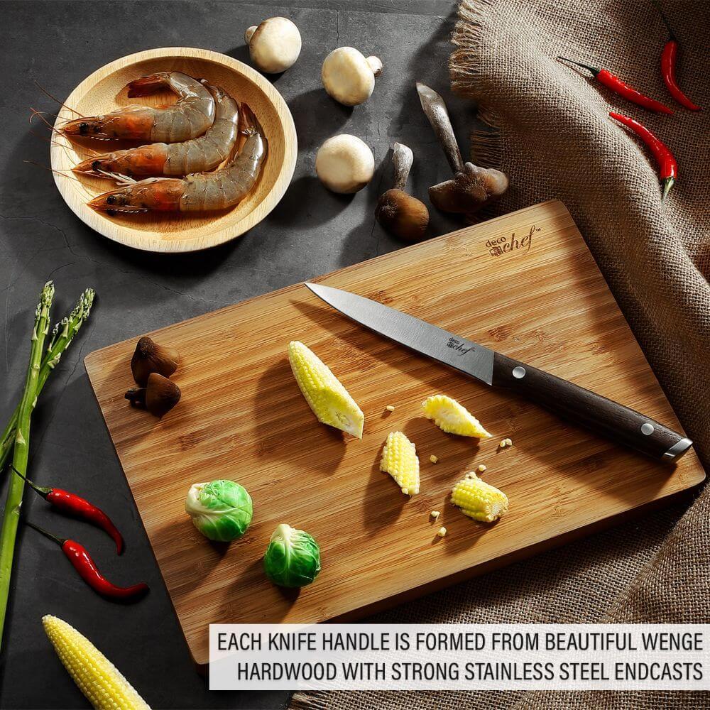 With bolstered handles and precision blades, this quality and reliable knife set will aid your cooking efforts for years to come. However, anyone that advertises an infinite blade for life is not completely honest – that’s why we include a knife sharpener and easy to follow care guide on how to maintain the health of your knife. At Deco Chef, We Do Delicious!