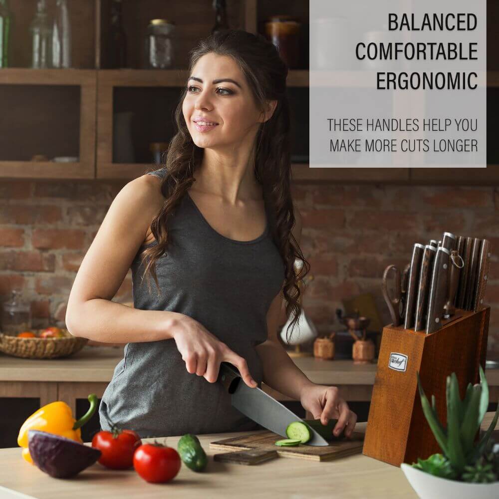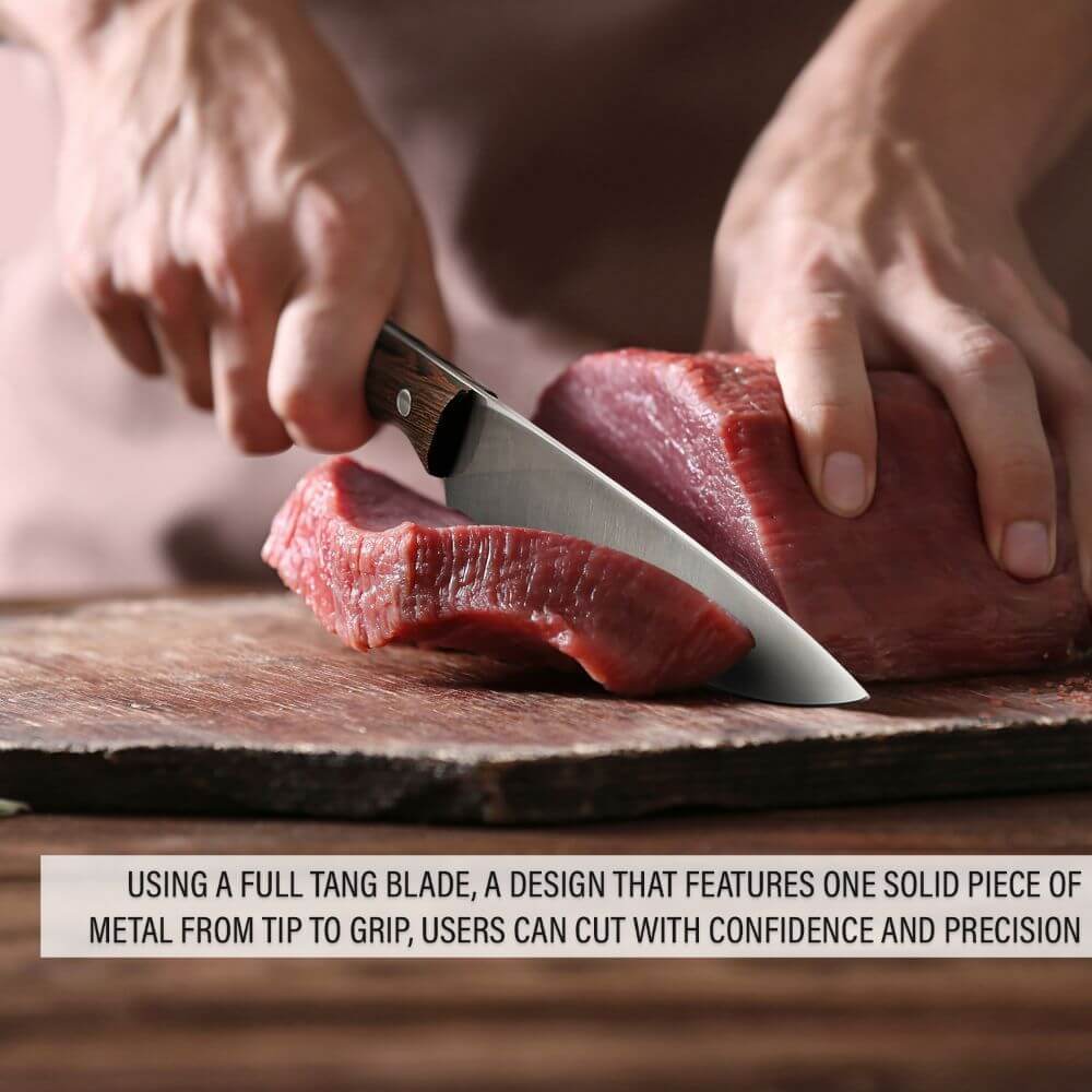 Each knife handle is formed from beautiful wenge hardwood with strong 430 stainless steel endcasts. Using a full tang blade, a design that features one solid piece of metal from tip to grip, users can cut with confidence and precision. Balanced, comfortable to hold, and ergonomically shaped, these handles allow you to make cuts for longer while easing soreness and pain.