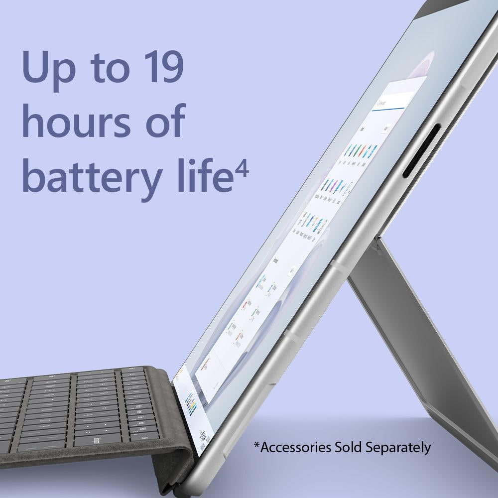 Whether youāre video calling on Microsoft Teams, streaming, or working, ultra-portable Surface Pro 9 with 5G delivers full laptop power with up to 19 hours of battery life.