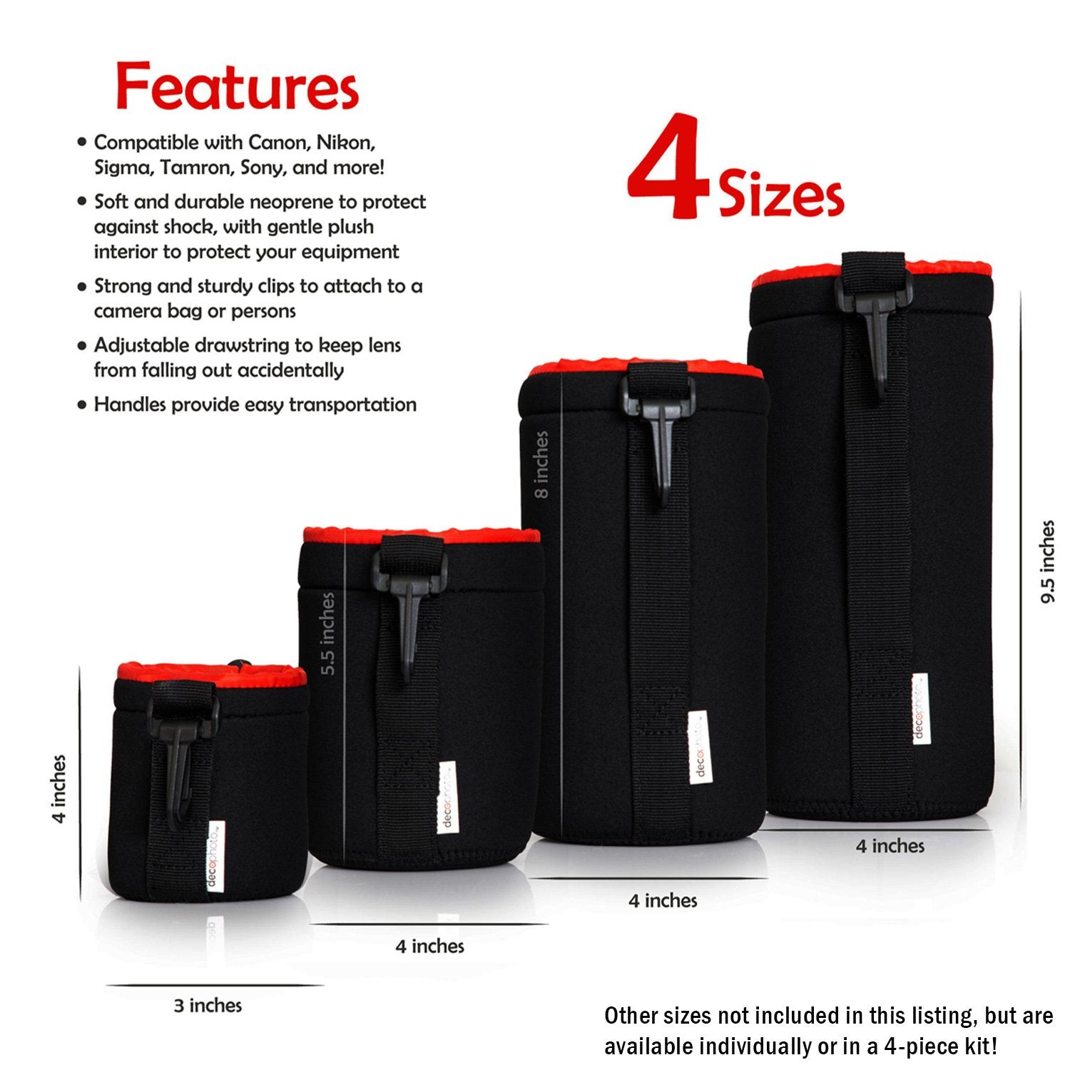 Compatible with almost all camera lenses, each bag size features a simple pull-cord closure system, allowing fast access and storage. A belt loop and carabiner provide fast and secure transport options when on-the-go.