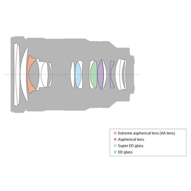 - 50 line pairs/mm resolving power, XA (extreme aspherical) elements with 0.01 micron surface precision, Constant F2.8 max aperture, Natural, lifelike defocused bokeh, 9-blade circular aperture, Direct Drive SSM, Nano AR coating, Dust and moisture resistant