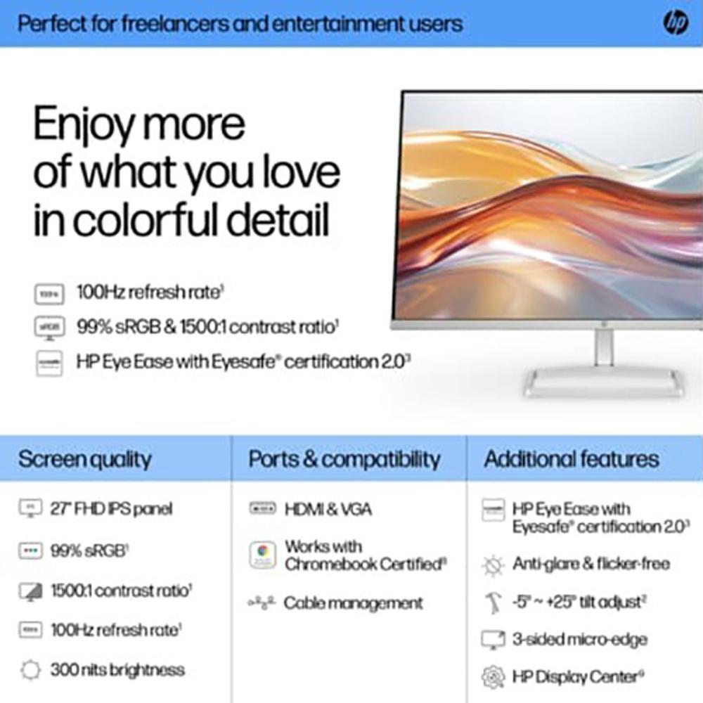 Get lost in any passion project with the HP Series 5 27-inch FHD Monitor. Its sleek, thin-and-light design gives you the flexibility to enjoy entertainment while vibrant color and deep contrast ratio lets you see everything as it was meant to be seen. Enhance your screen time and your pastime with a higher refresh rate for a screen-tear-free experience.