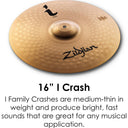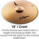 - 16", 18" Crashes: 2 sizes for dynamic, shimmering accents