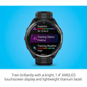 Train brilliantly with Forerunner® 965, the premium GPS running and triathlon smartwatch with a bright AMOLED touchscreen display and lightweight titanium bezel. Wake up to your morning report with HRV status to see health insights with an overview of sleep, recovery and training outlook (data presented is intended to be a close estimation of metrics tracked). The training readiness feature tells you when you’re primed for a productive session — while daily suggested workouts adapt to performance and recovery alongside the race widget, which provides training tips, course details and completion time predictions. Navigate any route confidently with multi-band GPS and full-color, built-in maps. With traditional buttons and a touchscreen display, it’s easy to tap into your training status and know whether you’re training productively, peaking or strained. If you’re pushing to outshine the competition, the Forerunner 965 is there to light up every run with up to 23 days of battery life in smartwatch mode.