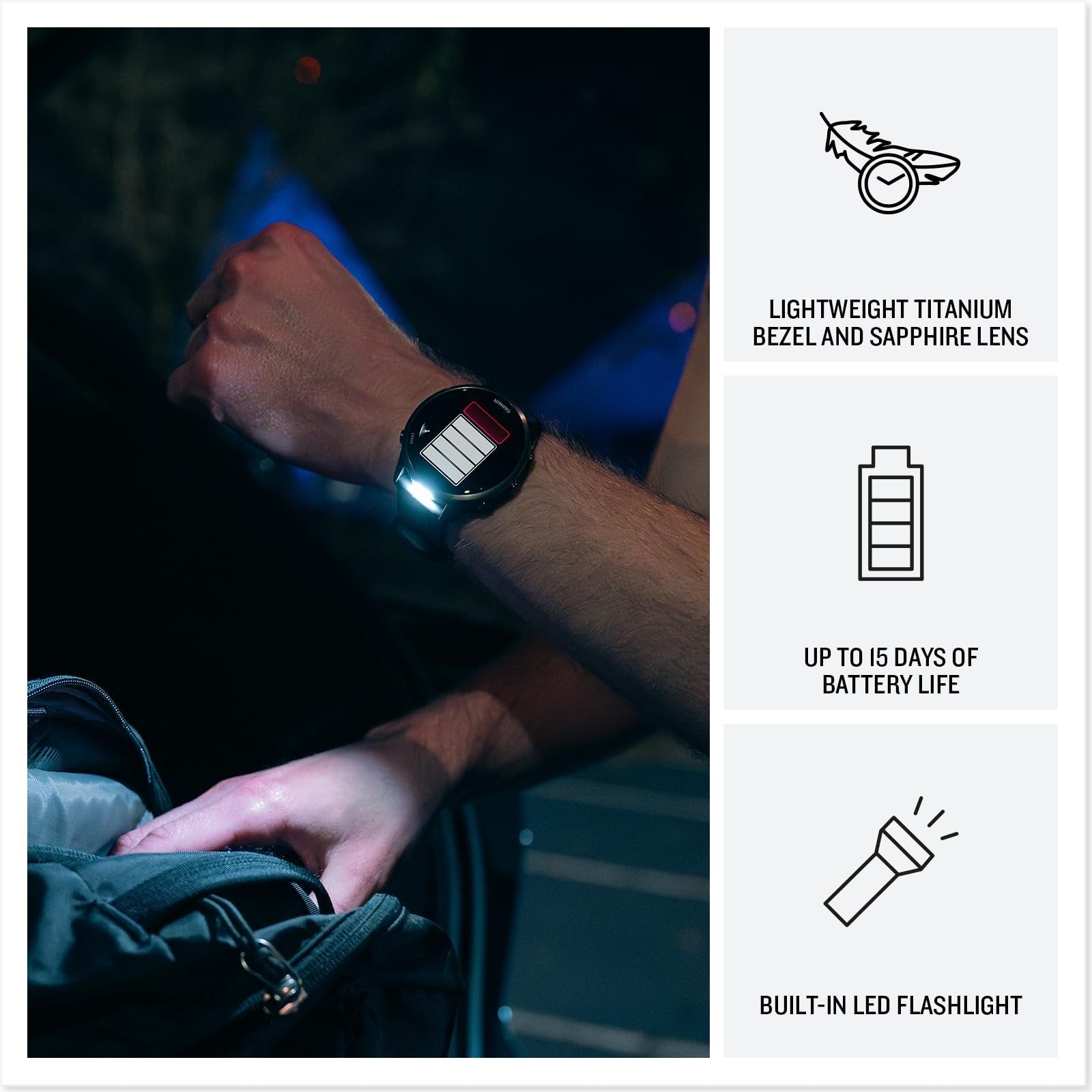 - LIGHTWEIGHT TITANIUM BEZEL AND DURABLE SAPPHIRE LENS