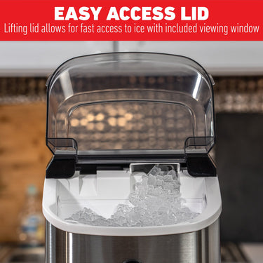 Operation is simple. Manually fill the water reservoir and with one button press your ice maker will get to work. Watch ice making progress with opening the see-through lifting access lid. With another button press, you can activate the self-cleaning mode and utilize the built-in drain plugs to dry out your ice maker when not in use.