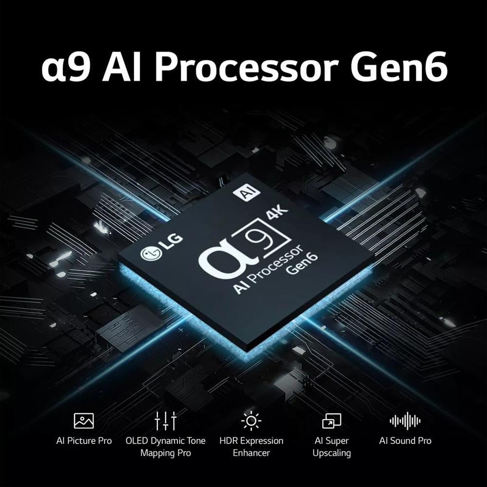 The OLED evo C-Series is powered by the α9 AI Processor Gen6—made exclusively for LG OLED—for beautiful picture and performance. The Brightness Booster improves brightness so you get luminous picture and high contrast, even in well-lit rooms. AI-assisted deep learning analyzes what you're watching to choose the best picture and sound setting for your content.