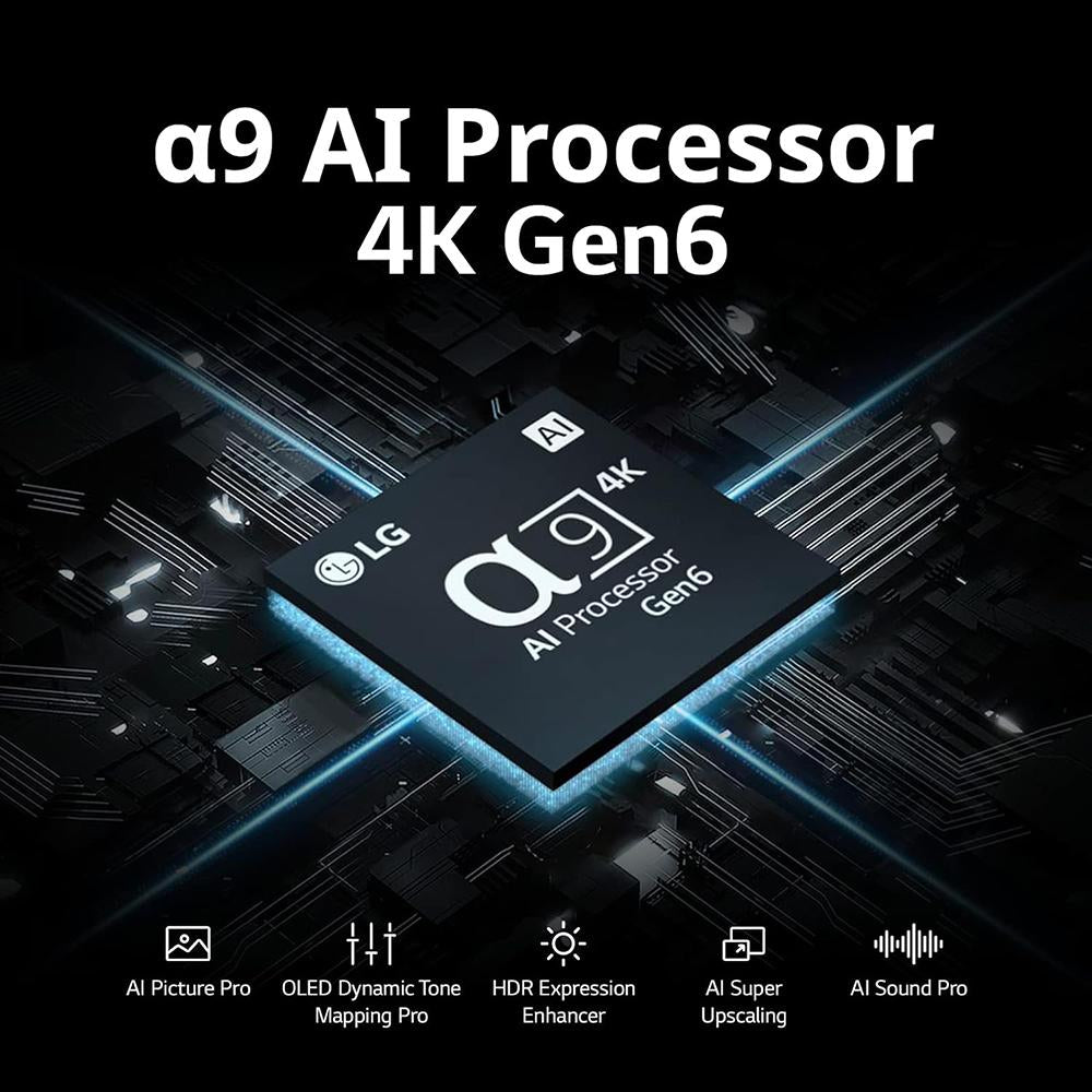 The OLED evo C-Series is powered by the α9 AI Processor Gen6—made exclusively for LG OLED—for beautiful picture and performance. The Brightness Booster improves brightness so you get luminous picture and high contrast, even in well-lit rooms. AI-assisted deep learning analyzes what you're watching to choose the best picture and sound setting for your content.