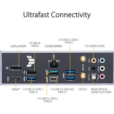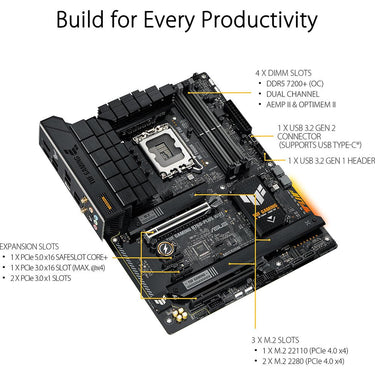 TUF GAMING B760-PLUS WIFI takes all the essential elements of the latest Intel processors and combines them with game-ready features and proven durability. Engineered with military-grade components, an upgraded power solution and a comprehensive cooling system, this motherboard goes beyond expectations with rock-solid performance for marathon gaming. TUF GAMING motherboards also undergo rigorous endurance testing to ensure that they can handle conditions where others may fail. Aesthetically, this model incorporates an embossed nameplate and geometric design elements to reflect the dependability and stability that defines the TUF GAMING series.