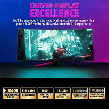 This 40” IPS monitor guarantees vibrant colors and remarkable clarity. You'll be enveloped in a truly captivating visual environment with a gentle 2800R monitor radius and a cinematic 21:9 aspect ratio.