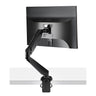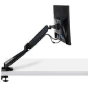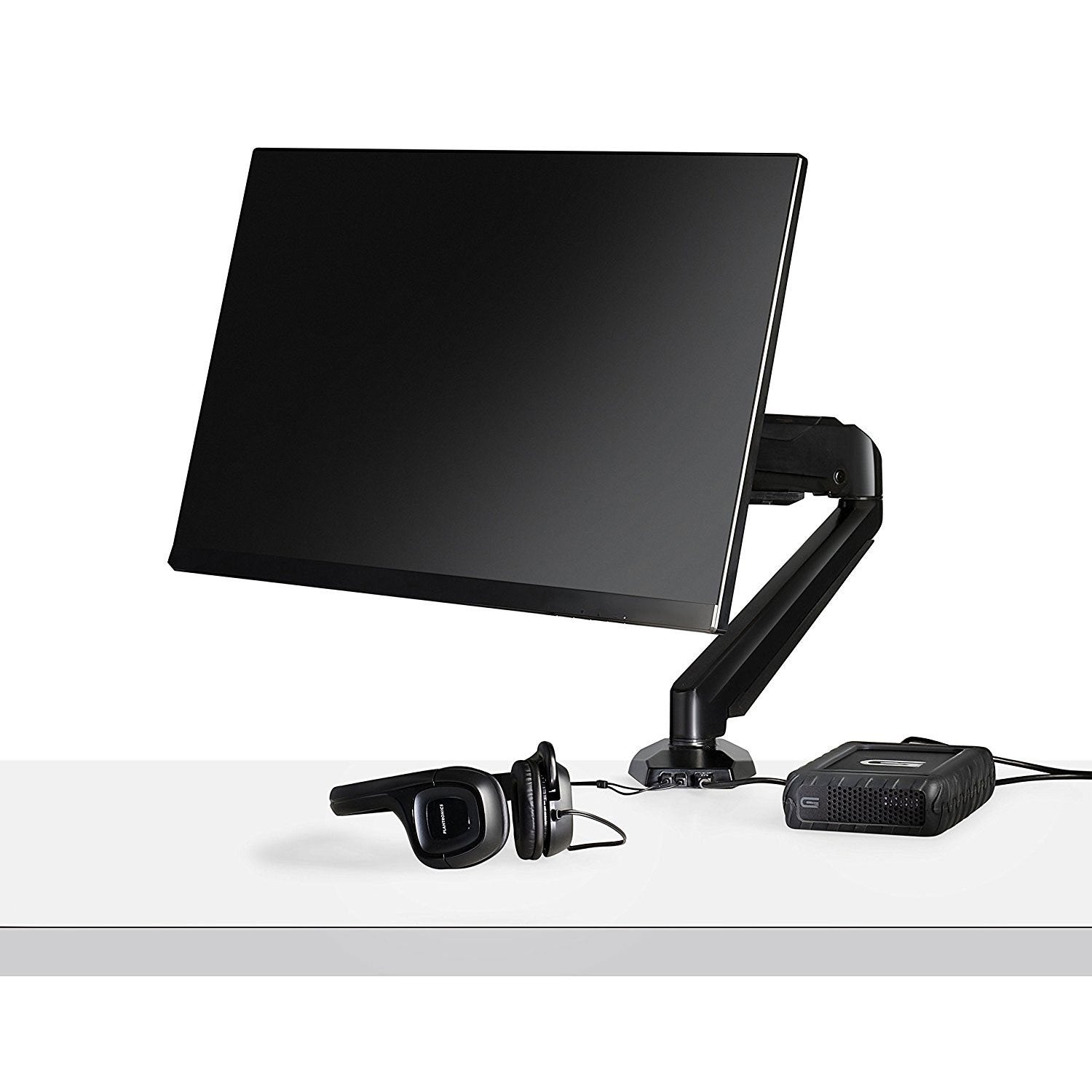 The Ultra-Flex Single-Arm Monitor Desktop Mount from Fotolux is a sturdy and secure monitor mounting system capable of supporting displays from 15 to 27 inches long. It's constructed out of rugged aluminum and utilizes gas spring mechanisms to hold monitors up to 17.6 pounds. With two articulating halves, this mount lets you swivel, tilt, rotate, and adjust the height of your monitor to your preferred viewing experience. A low-profile clamp ensures it is compatible with most desks, and integrated USB 3.0 and audio ports offer convenient desktop access.