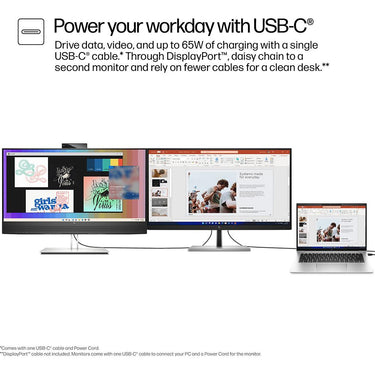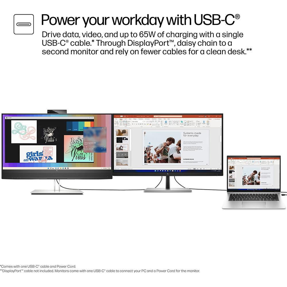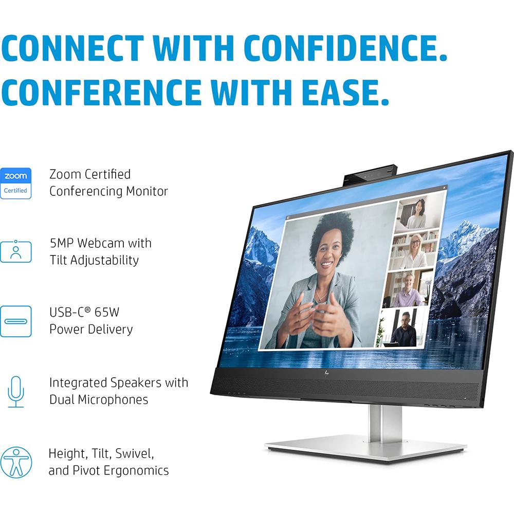 Conference and connect with ease with the Zoom Certified HP E27m G4 USB-C Conferencing Monitor that has an integrated 5MP, tilt-adjustable webcam, front-firing speakers, and dual mics. Work effortlessly and simplify your set up with one USB-C cable that delivers data, video, and up to 65W of laptop charging.