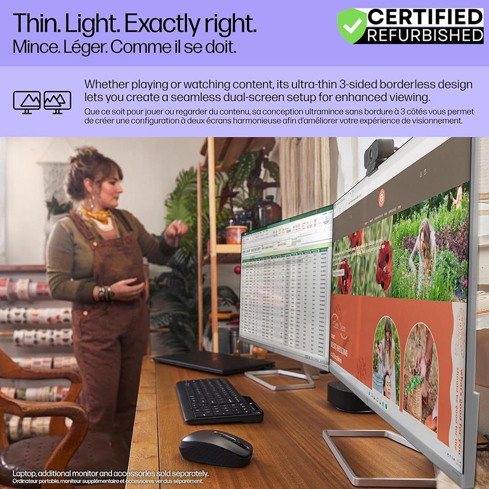 This thin-and-light 23.8-inch FHD monitor is designed to look great in any space. Whether learning, playing, or watching content, its ultra-thin 3-sided borderless design lets you create a seamless dual-screen setup for enhanced viewing, while the simplified cable management cuts the clutter. Plus, easily connect with HDMI 1.4 and VGA ports.