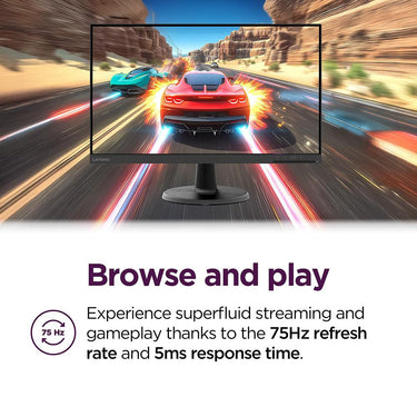 The Lenovo D24-40 Monitor is designed to enhance your productivity and gaming fun. The monitor’s 23.8-inch VA panel with 3-sided slim bezels delivers you a virtually 3-side NearEdgeless visual experience. No matter from which angle you are looking at the screen, the visuals remain powerful and consistent, thanks to its 178°/178° viewing angle. The FHD (1920 x 1080) resolution renders detailed imagery so your text looks sharp and gaming visuals lively. See the full spectrum of colors with the 72% NTSC color gamut support and let visuals come to life that perfectly balances brighter and darker parts of the imagery. Experience superfluid streaming and gameplay thanks to the 75Hz refresh rate and 5ms response time. The AMD FreeSync technology removes any latency so you get smooth, tear-free visuals. The Lenovo D24-40 Monitor’s TÜV Low Blue Light certification and Natural Low Blue Light technology ensure that extended screen time is easy on your eyes by protecting them from harmful blue light emission without distorting the originality of the visuals. Plug in any laptop, CPU, and audio devices to the monitor with its multiple connectivity options including HDMI, VGA, and audio-out ports. Adjust the monitor for optimal viewing comfort with the tilt option. You can also VESA Mount it for a neat and tidy workspace. The smart cable management system hides cables at the back of the monitor leaving you with more elbow room to work and play. Say hello to the new all-rounder with the Lenovo D24-40 Monitor!