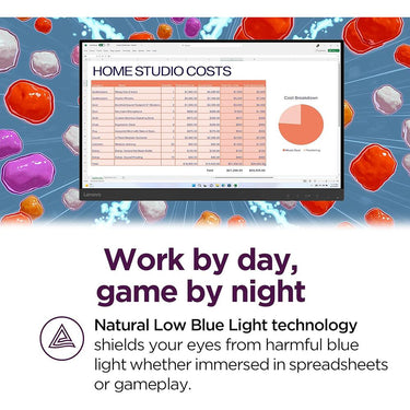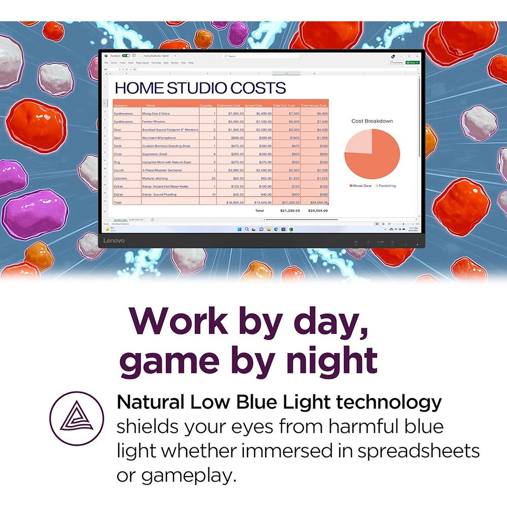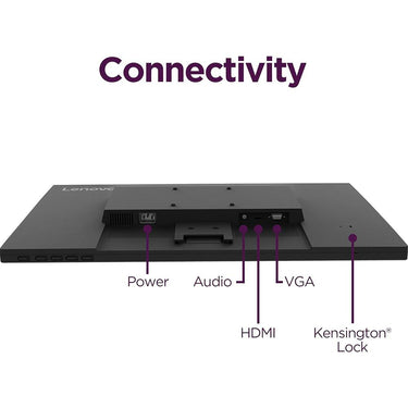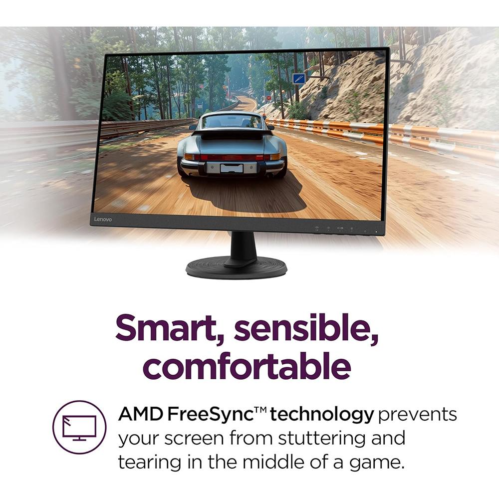 The Lenovo D27-40 Monitor is an impressive home office monitor that can double as your gaming and entertainment machine. Get an expansive view of your work documents, favorite web series, and addictive games on the bigger 27-inch 3-side NearEdgeless VA panel. From wherever you look at the screen, you see the consistency in the imagery without washed-out colors - thanks to the 178 degree/178 degree wide-viewing angle. The monitor's 72% NTSC color gamut offers vivid and captivating colors. Spot the finer details in spreadsheets or movements in gameplay with its FHD (1920 x 1080) resolution. The Lenovo D27-40 Monitor's 75Hz refresh rate and 5ms response time arm you with the speed to strike first. Matching the refreshing rate with the screen frame rate, AMD FreeSync technology prevents your screen from stuttering and tearing in the middle of a game. Your eyes are shielded from harmful blue light by the monitor's Natural Low Blue Light technology as you work or game for long hours. Seamlessly connect your laptop, PC, and speakers/headphones to the monitor through its HDMI, VGA, and audio-out ports. Adjust the monitor with just a tilt as your set it according to your ideal seating posture. The VESA Mount support comes in handy to further enhance your comfort by giving you more working space. You can bundle the wires and tuck them at the back of the monitor with its integrated cable management system for a tidy setup. After a long day's work, boot up the Lenovo D27-40 Monitor and get your A-game on!