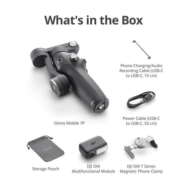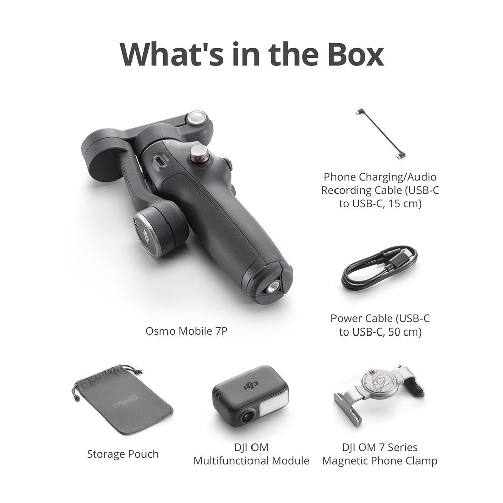 Capture every highlight effortlessly. Introducing Osmo Mobile 7 and Osmo Mobile 7P, designed to be lightweight, portable, and user-friendly. Featuring DJI's seventh-generation stabilization and ActiveTrack 7.0 technology, these smartphone gimbals take three-axis stabilization and intelligent tracking to new heights. With a range of intelligent features, capturing cinematic-quality footage has never been easier.Elevate your creativity with DJI Osmo Mobile 7P. Besides various advanced features, it includes a new Multifunctional Module that provides native tracking, audio, and lighting capabilities, ideal for content creators seeking to enhance their storytelling.Features:Easy Tutorials & One-Tap EditingPair the Osmo Mobile 7 Series with the DJI Mimo app to enjoy AI-powered one-tap editing and a range of exclusive video templates. From shooting to processing, it's a one-stop solution truly friendly for new creators. ShotGuides automatically analyzes your scenario and recommends a shot sequence, along with a tutorial for how to get it. Choose from a range of templates, follow the instructions, and shoot like a pro in no time.Built-in Extension Rod & TripodWith the built-in extension rod, you can include more friends, pets, or stunning scenery in your selfies, and unlock creative high and low angles for your vlog shots. The built-in tripod eliminates the need for additional accessories. Simply unfold it for stable placement, making solo creation effortless and storage hassle-free.Snap the SpectacularThe Multifunctional Module packs intelligent tracking, DJI Mic Mini reception, and lighting features into one compact unit. Pair it with your phone gimbal for ideal shots every time.Experience Seamless Stability Osmo Mobile 7P's robust 3-axis gimbal stabilization ensures lossless stability. Capture creative bursts and craft stunning, cinema-quality masterpieces with ease.Robust 3-Axis Gimbal StabilizationThe Osmo Mobile 7 Series utilizes DJI's seventh-generation stabilization technology to provide consistent stability without compromising image quality. Capture bursts of inspiration and create stunning, cinema-quality masterpieces with phones weighing up to 300 grams.Capture Like a Pro From Day OnePair your Osmo Mobile 7P with DJI Mimo for ShotGuides and One-Tap Edit. Film and edit like a pro, saving time and enhancing your creative storytelling instantly.So Quick, So Easy Unfold the gimbal to power it on. Easily mount a paired smartphone with the magnetic design, and the Mimo app pops up automatically so you can film instantly.Empower Your Steady Creativity Osmo Mobile 7P offers a max operating time of 10 hours. When the Multifunctional Module acts as a mic receiver, the gimbal also delivers extra power to your phone.Experience Seamless Stability Osmo Mobile 7's robust 3-axis gimbal stabilization ensures lossless stability. Capture creative bursts and craft stunning, cinema-quality masterpieces with ease.Streamline Your Creativity The Osmo Mobile 7 phone gimbal features an integrated foldable design with a built-in tripod, making solo creation effortless and storage hassle-free.Key SpecsMaximum Weight Capacity0.66 poundsCompatible DevicesSmartphoneAuto Tracking FeaturesObject recognition, FaceGeneralProduct NameOsmo Mobile 7P Smartphone 3-Axis Gimbal StabilizerBrandDJIModel NumberCP.OS.00000401.02ColorBlackDimensionsMaximum Weight Capacity0.66 poundsMaximum Extended Length11.3 inchesSocket Size1/4 in.Product Weight0.81 poundsCompatibilityCompatible DevicesSmartphoneStabilizer and Support TypeGimbalBrand CompatibilityUniversalModel CompatibilityApple, HUAWEI, HONOR, Samsung, Xiaomi, OPPO, vivo, OnePlus, Google, NothingConnectivityAuto Tracking FeaturesObject recognition, FaceApp CompatibleYesWireless ConnectivityBluetoothMaterialMaterialMetal, PlasticFeaturesBase TypeExtendable grip, Tripod gripNumber of Axis3-AxisFoldable DesignYesShutter Release ButtonTRUENon-Slip GripTRUEPowerRechargeable BatteryYesBattery ChemistryLithium-polymerCharging Interface(s)USB-CBattery Capacity3350 milliampere hoursBattery Life (up to)10 hoursBattery Charge Time2.5 hours