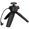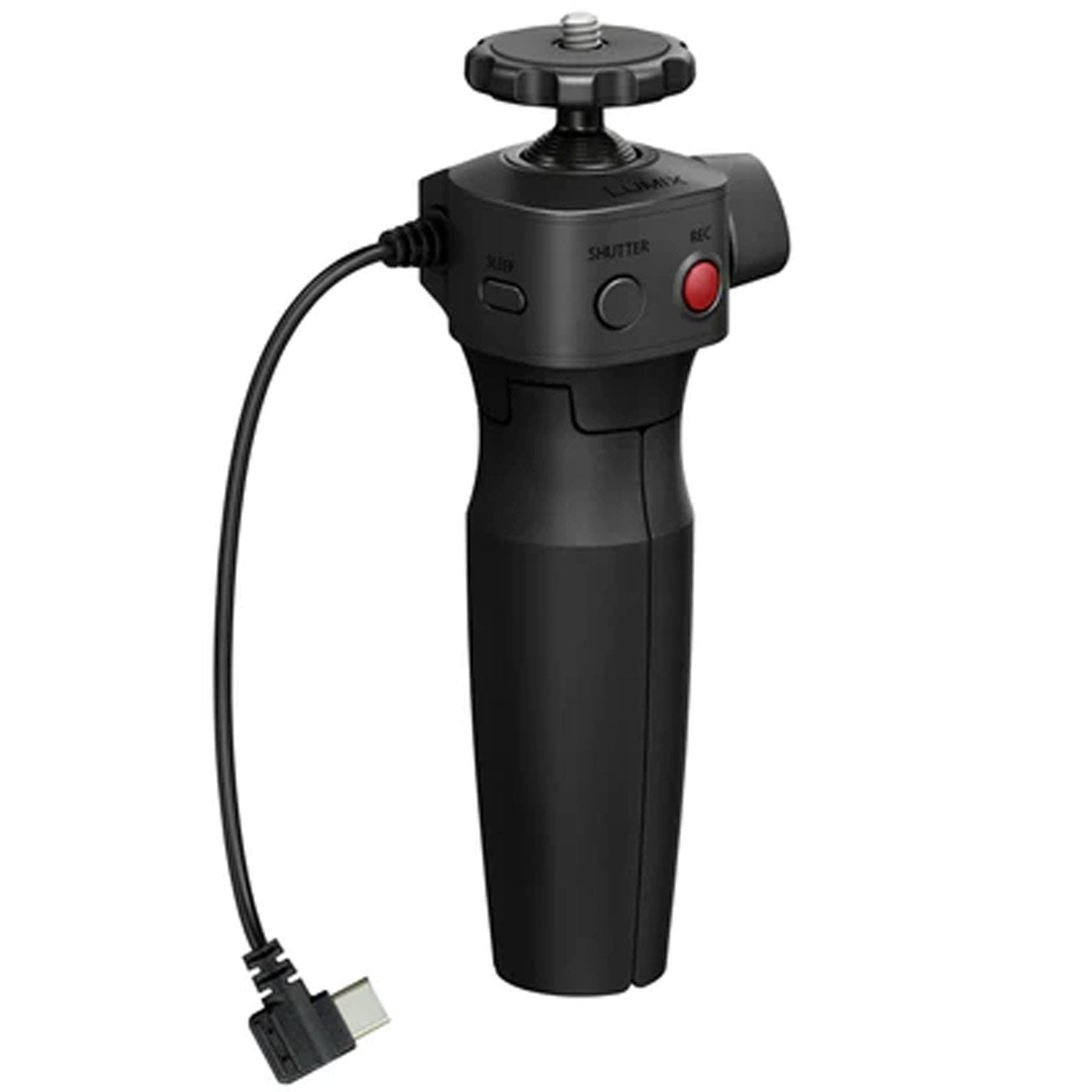 The LUMIX tripod grip, compatible with G100D, offers stable one-handed shooting and tripod functionality, with a USB C wired connection and features Video Rec, Shutter, and Sleep Button for easy control.