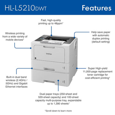 The Brother HL-L5210DWT Business Monochrome Laser Printer is engineered to deliver fast, reliable, and cost-efficient printing for busy offices, small workgroups, and shared workspaces. With professional-grade performance, robust paper handling, and flexible connectivity, this monochrome laser printer helps keep productivity high while reducing operating costs. Its dual paper trays (250-sheet + 520-sheet), along with a 100-sheet multipurpose tray, provide generous capacity straight out of the box with scalability up to 1,390 sheets as your needs grow. Automatic two-sided printing saves time and reduces paper usage, while support for mobile and network printing ensures seamless workflows across devices. Built-in dual-band wireless networking and Gigabit Ethernet make it easy to share the printer on wired or Wi-Fi networks, and advanced security features help protect sensitive documents and restrict unauthorized access. Whether printing reports, invoices, contracts, or bulk documents, the HL-L5210DWT combines professional speed and quality with the durability that business environments demand.
