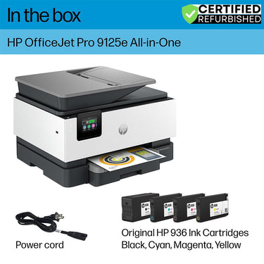 HP OfficeJet Pro 9125e AiO Printer; HP 936 Setup Black Ink Cartridge; HP 936 Setup Cyan Ink Cartridge; HP 936 Setup Magenta Ink Cartridge; HP 936 Setup Yellow Ink Cartridge; Regulatory Flyer; Ink Caution Flyer; Power Cord; Setup Poster; Reference Guide [For more information about fill and yield, see https://www.hp.com/go/learnaboutsupplies ]