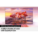 QLED TV displays an intricately colored image of flamingos to demonstrate color shading brilliance of Quantum Dot technology. Compared to SDR technology, the sunset prairie image on the right which has HDR10+ logo shows a wider range of contrast created by Quantum HDR technology. Quantum Dot technology delivers our finest picture ever. With Color Volume 100%, Quantum Dot takes light and turns it into breathtaking color that stays true at any level of brightness.