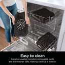 The ceramic-coated, removable grill grate, crisper basket, and cooking pot are all dishwasher safe, easy to clean, and PTFE/PFOA-free.