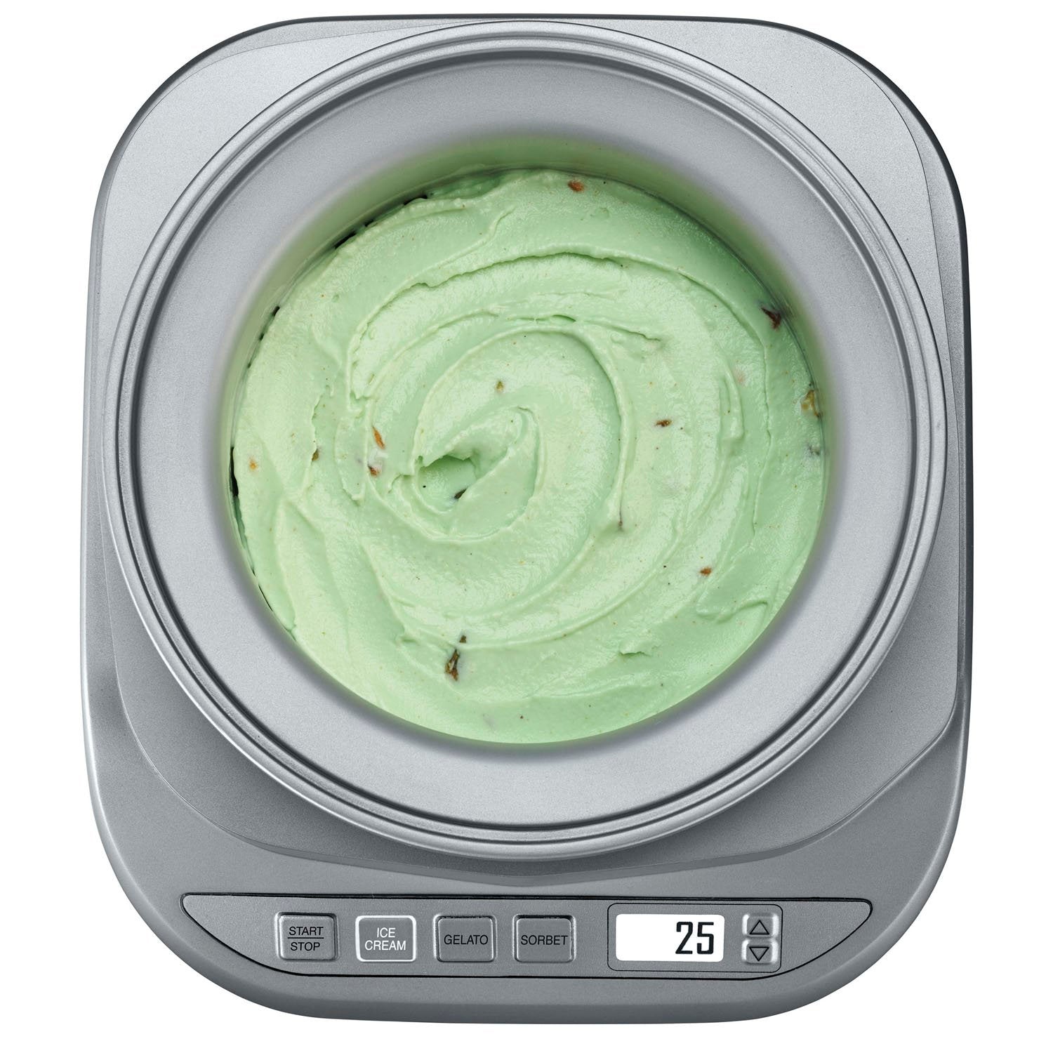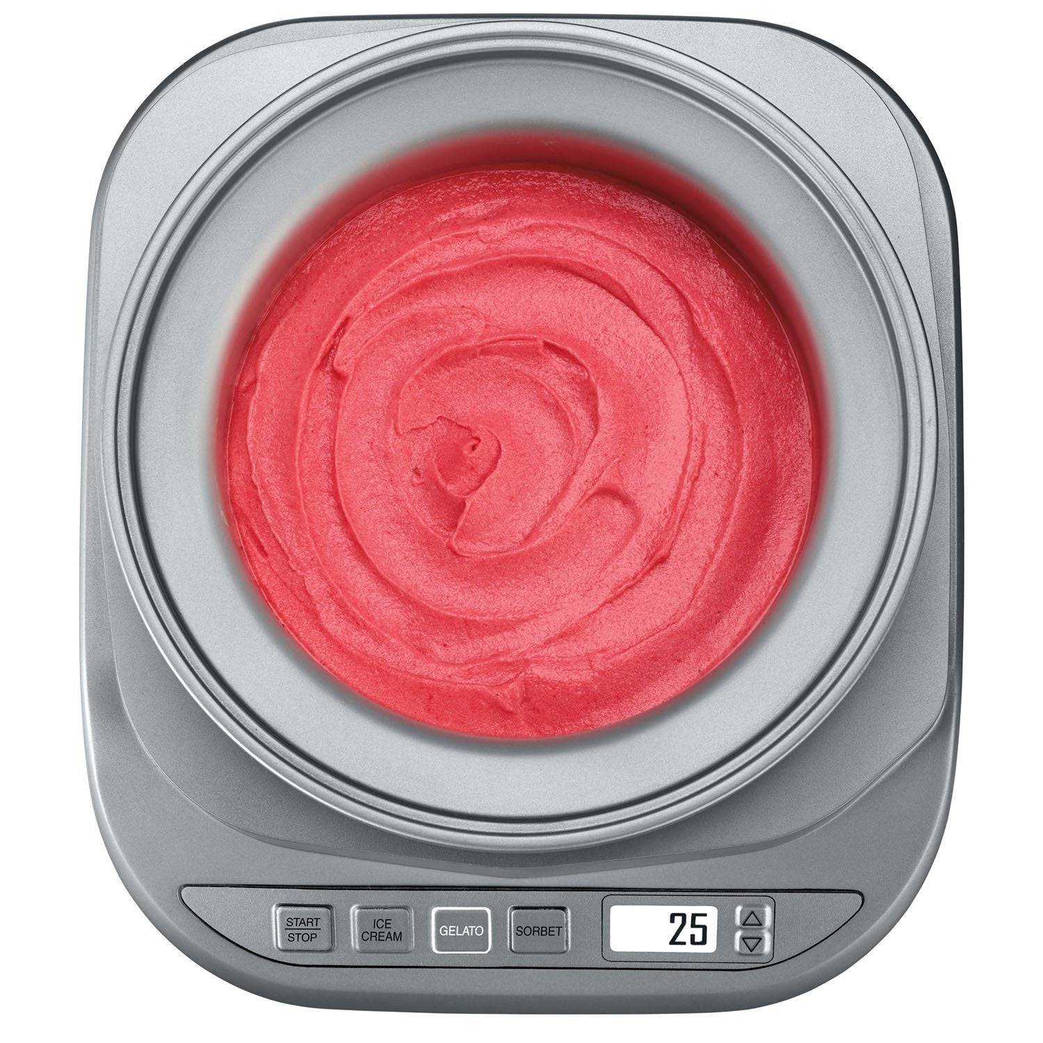 At the touch of one button, you can create two quarts of delicious frozen treats with the Cool Creations Ice Cream Maker in just 20 minutes. Making homemade ice cream, gelato, frozen yogurt, and sorbet of any type in any flavor couldn't be easier with one-button operation for ice cream, gelato, and sorbet, convenient digital LCD time programming, and auto shutoff. The unique paddle makes fast work of processing. The sleek brushed metal housing makes it look as good as the treats it creates for your family and friends.