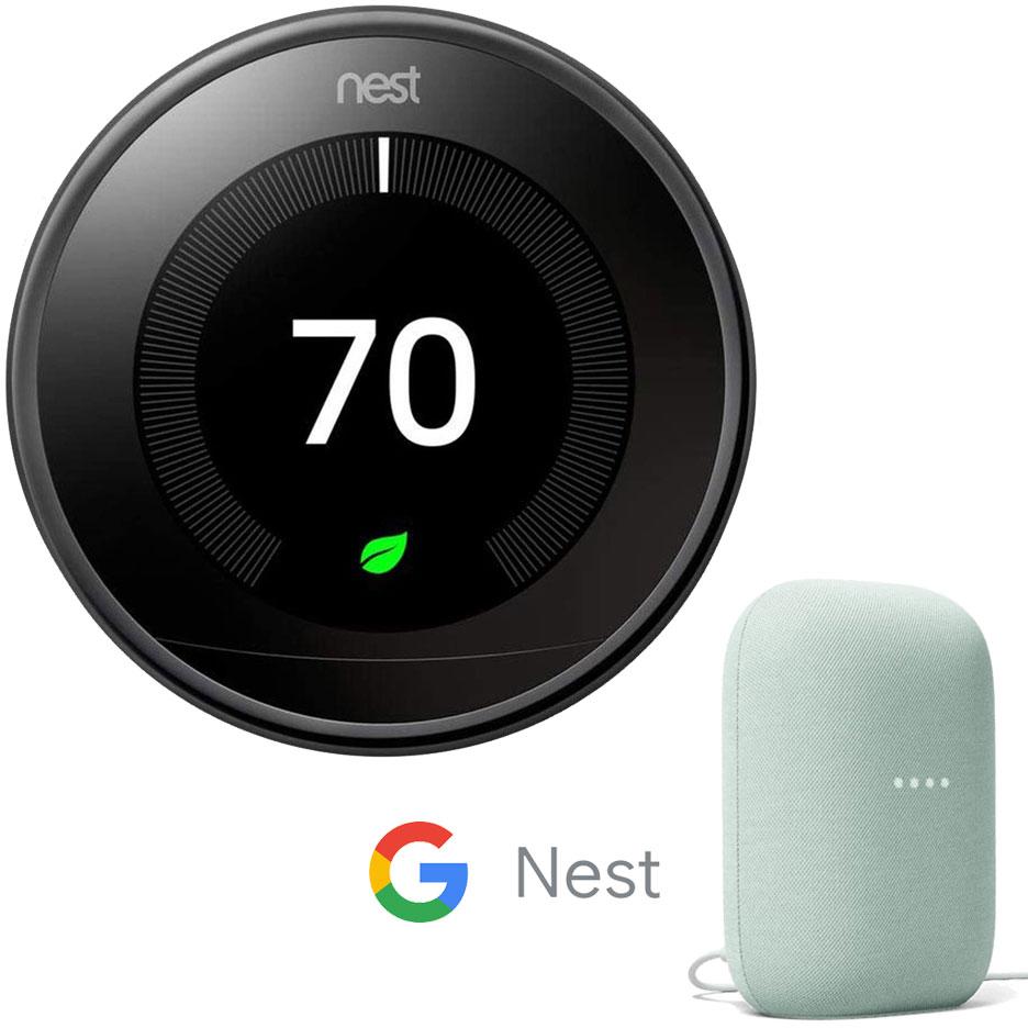Google Nest 3rd Gen Learning Thermostat (Black) T3018US Bundle with Smart Speaker (Sage)