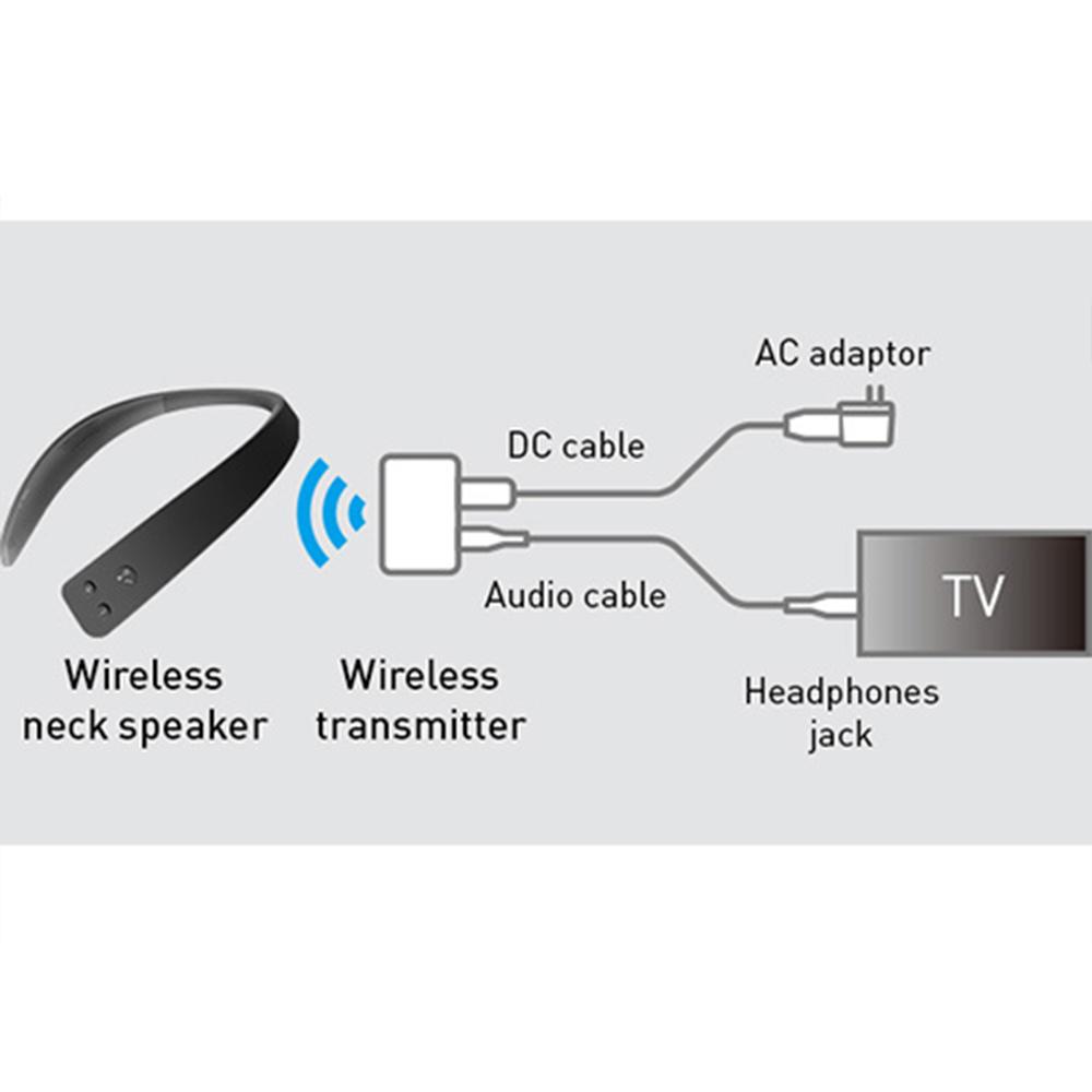 The WN10 does not require any TV connection settings with the included wireless transmitter; connect the wireless transmitter to the headphone jack on the TV with the audio connection cord and the AC adaptor, and the system is ready.