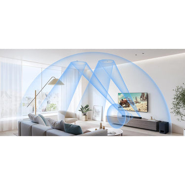 Acoustically designed to deliver cinematic spatial sound with 3 front-firing speakers, including a dedicated center speaker for clear dialogue. Additional dual up-firing speakers bounce sound above you adding an elevated dimension to your movies. The soundbar is accompanied by an included subwoofer for rich, powerful bass.
