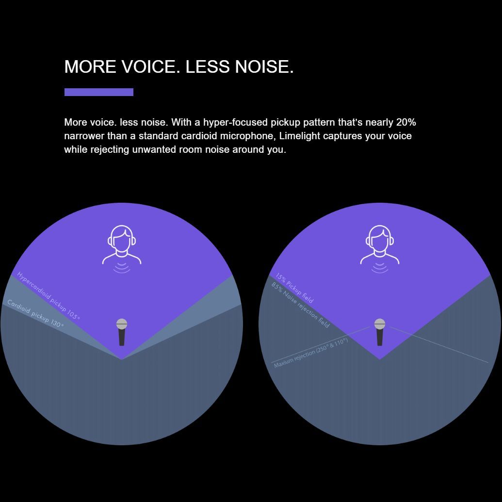 More voice. less noise. With a hyper-focused pickup pattern that’s nearly 20% narrower than a standard cardioid microphone, Limelight captures your voice while rejecting unwanted room noise around you.