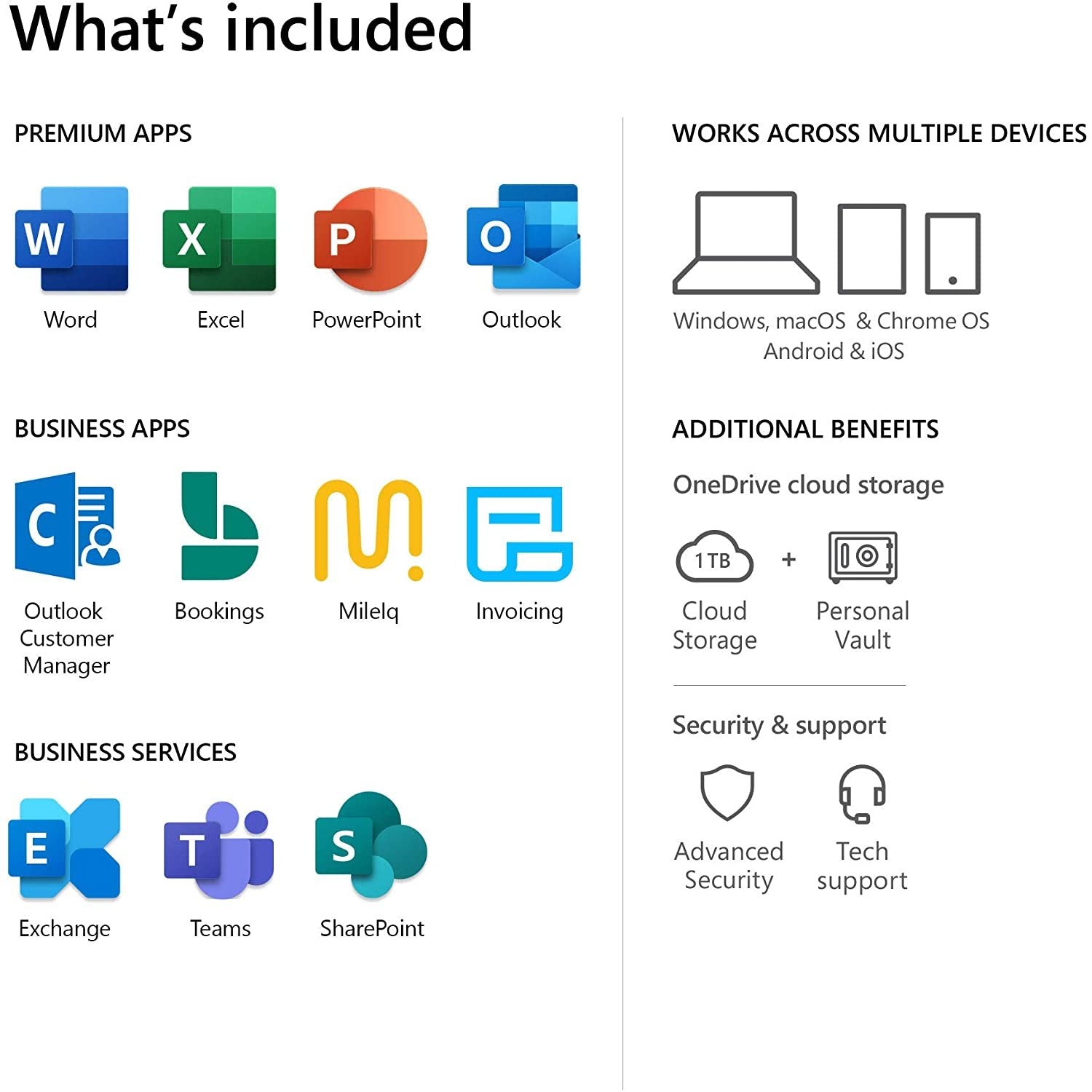 Best for businesses that need Office apps across devices plus business email, cloud file storage, and online meetings and chat.