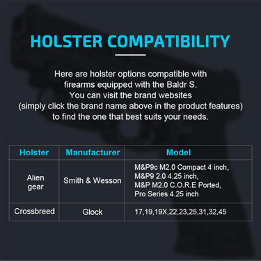 Holster Compatibility: Baldr S is compatible with the following holster brands: Alien Gear, Crossbreed, Werkz, Bucks, Red Hill Tactical.