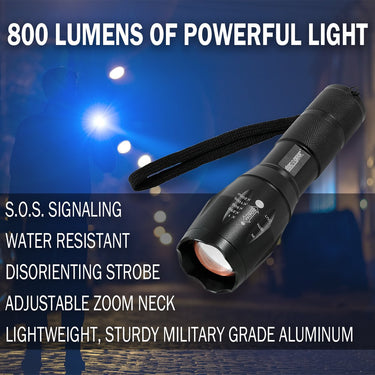 LIGHT THE WAY - The aluminum flashlight provides 800 lumens of bright and powerful light. Featuring an adjustable zoom neck, control the directional output of this light for either wide, sweeping coverage, or a focused, powerful beam. A strobe function can disorient attackers or wildlife in certain situations and is handy to carry with you at night