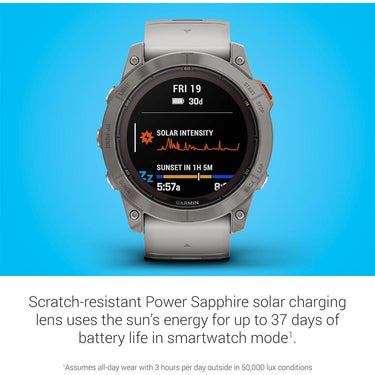 Get up to 37 days in smartwatch mode with solar charging in 3 hours of direct sunlight (50,000 lux) per day and up to 122 hours in GPS mode with solar charging (assumes continuous use for entire period in 50,000 lux conditions).