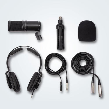 The ZDM-1 Podcast Mic Pack includes a broadcast-style dynamic mic, professional closed-back headphones, an adjustable tabletop mic stand, windscreen and 2-meter mic cable.