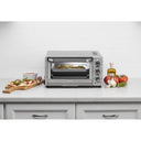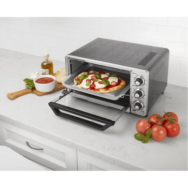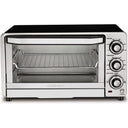 Compact cooking versatility and modern design make this countertop Custom Classic Toaster Oven Broiler an ideal choice for your lifestyle. Brushed stainless and black housing is outfitted with a wire rack, broiling rack and baking/drip pan to handle your tasting, baking, and broiling needs. The nonstick interior and removable front crumb tray are easy to clean. The Always Even™ Shade Control monitors the toasting temperature and will automatically adjust the timing to produce the desired toast every time; auto slide-out rack means convenient, hands-free loading and removal of foods. The cool touch handle and automatic shutoff means safety is ensured.