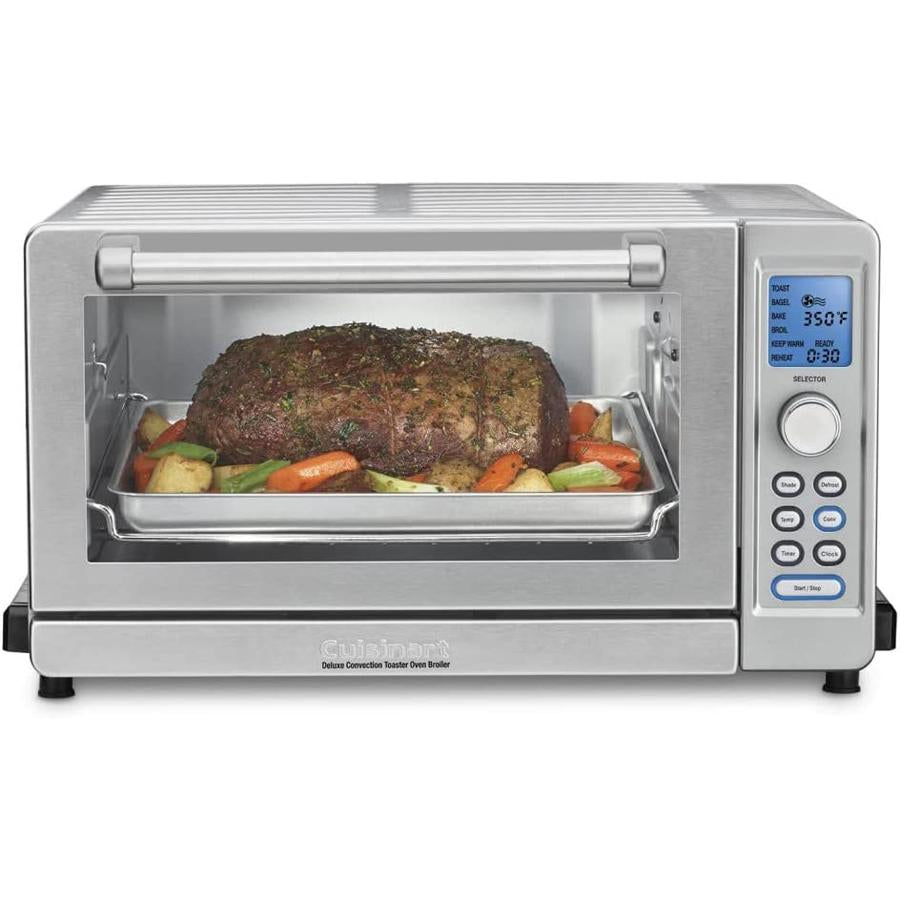The Cuisinart® Deluxe Convection Toaster Oven Broiler has 9 functions, including convection, to handle your family’s cooking needs. You can bake delicious cakes, roast potatoes, and crisp juicy roasts with this kitchen workhorse. With 0.6 cubic foot capacity, the Toaster Oven fits a whole chicken, a 12-inch pizza, or 6 slices of bread, and is conveniently controlled by an electronic dial and LED buttons. The Exact Heat™ sensor maintains precise temperatures, and the Always Even™ shade control ensures toast will meet your family’s tastes.