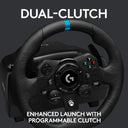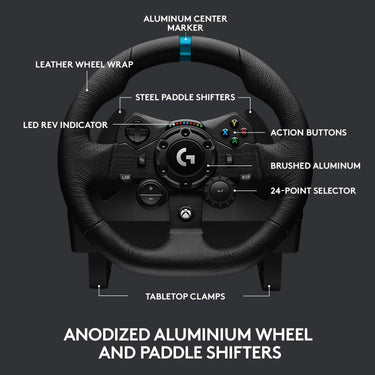 Logitech 941-000156 G923 Racing Wheel and Pedals for Xbox X S, Xbox One and PC - Meet the re-engineered Logitech G923, a high-performance racing wheel that revolutionizes the eracing experience with next-generation TRUEFORCE feedback technology. TRUEFORCE: Unleash your passion for racing with high-definition force feedback. TRUEFORCE connects directly to game engines, processing at 4000 times a second to produce next-gen realism and detail in supported games Programmable dual clutch: Get off the starting line faster with maximum traction and minimum smoke in supported games Control the race: 24-point selector, RPM LEDs, integrated Xbox Series X S, Xbox One or PC game controls, and progressive brake spring all help you maintain control of your vehicle at high speeds in supported games Crafted with Premium Materials: refreshed Logitech G design with brushed metal wheel, hand-stitched leather wheel cover, and polished metal pedals Total Wheel Control: Control wheel sensitivity, force feedback levels, and button customization via powerful G HUB Gaming Software for PC. Download at logitechG.com/downloads Compatible with most racing games on Xbox Series X S, Xbox One and PC, with select titles specially designed for TRUEFORCE. Package Contents: Steering wheel, Pedals, Power supply and User documentation. Features: Premium Build: Brushed metal, leather stitching, polished pedals. Dual Clutch: Get off the starting line faster with more traction, less smoke. On-Wheel Controls: Xbox One/PC or PS4/PC controls (two models available). Rev Indicator: Color LEDs show RPM. See when you?re redlining. TRUEFORCE: Next-gen force feedback for unprecedented realism. 24-Point Selector: Control traction, torque, brake force and more. Polished Metal Pedals: Clutch, throttle and updated brake pedal featuring a progressive spring for a more responsive feel. G HUB Customization: Personalize wheel sensitivity, force feedback levels, button actions and more via G HUB Gaming Software for PC. System Requirement: Xbox One game system, PC with Windows 7 or later + 150 MB of available hard disk space, Game that supports Logitech force feedback racing wheel, USB 2.0 port, Internet access for Logitech G HUB software.