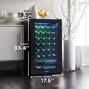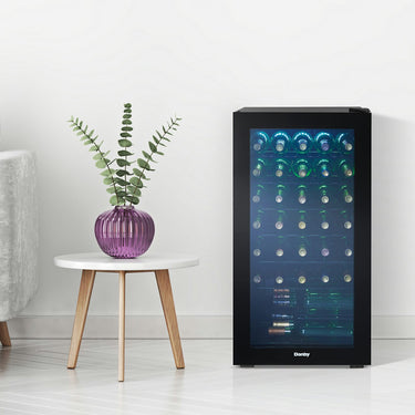 Danby's free-standing wine cooler is a stylish and convenient solution for storing and chilling your wine collection. It can hold up to 36 bottles on elegant black wire shelving and features blue LED interior lighting. The elegant tempered-glass door showcases the bottles, while the temperature ranges from 43°F to 57°F. The appliance has a discreet pocket-style handle and a smooth, sleek back design, and comes with a 12-month warranty on parts and labor.