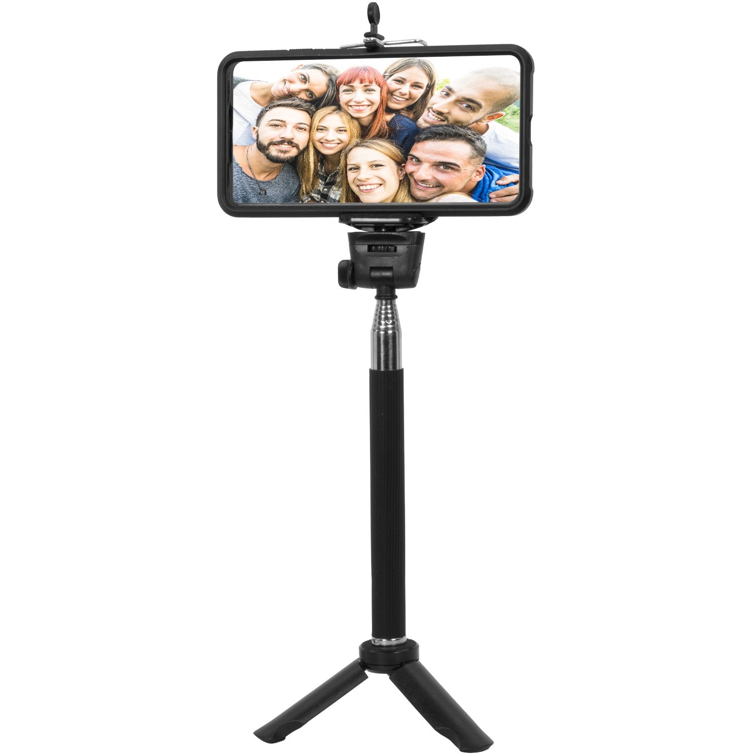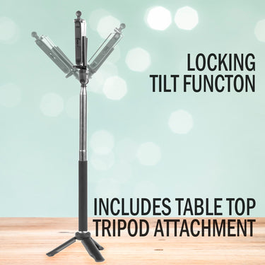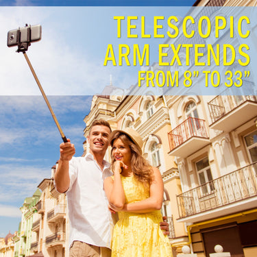 - Metal telescopic selfie stick extends from 8" to 33"