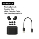 Earbuds, a charging case, USB charging cable, four sizes of earbud tips
