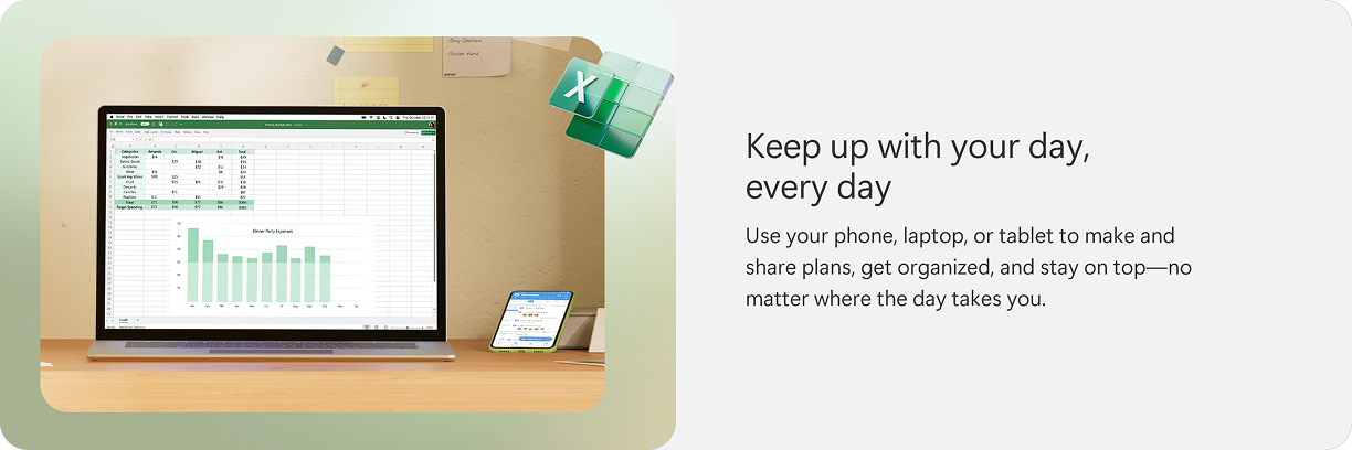 AI-powered features in Microsoft 365⁴ seamlessly tackle your to-dos and easily track budgets, personal projects, and calendars
