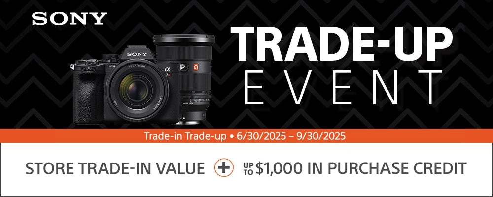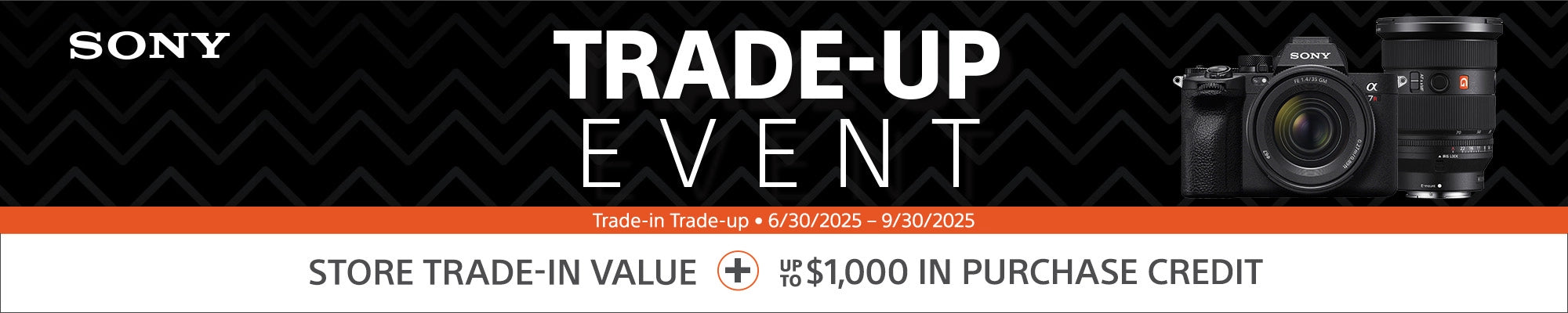© 2025 Sony Electronics Inc. All rights reserved. Sony, its logo and the Sony A logos are trademarks of Sony Corporation. Prices and offers non-redeemable for cash, non-transferable and may not be combinable with other offers/discounts. Reseller prices may vary. Prices and offers stated do not include tax or shipping. Specifications, availability, prices and terms of offer are subject to cancellation or change without notice. Sony is not responsible for photographic, typographic or system errors. Participating Sony Authorized Dealers will add a discount as specified herein to consumers who trade-in one (1) interchangeable lens camera (film, DSLR, or mirrorless) or lens to purchase one (1) select new models listed herein, usable at the time of Final Checkout or at the cash register. Dealer determines the trade-in amount at its sole discretion and Dealer's trade-in amount may vary according to condition and age of the trade-in. The discount amount is not a cash equivalent, may not be redeemed for cash, and is available only for the purchase of a new Sony item listed here-in at the time of trade-in. The discount to the customer is forfeited if the new model listed herein is returned for any reason or cause whatsoever. The traded-in/used product must be surrendered at time of trade-in (for e-commerce execution, physical receipt by the dealer or notification from carrier is considered an act of surrender). Multiple discounts cannot be combined and applied to the purchase of any one item.