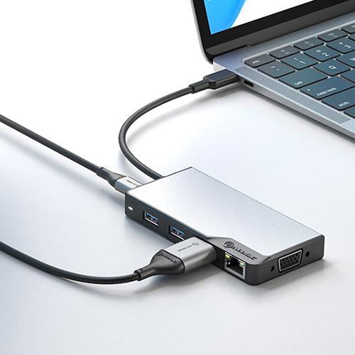 The USB-C Fusion MAX 6-in-1 Hub features six ports to extend the connectivity of USB-C enabled phones; tablets; and laptops. Plug in your device to the HDMI port to mirror or extend your screen in Ultra HD; or use the VGA connection for up to 1080p Full HD support. Connect to the USB-C port for up to 100W power delivery pass-thru; or to quickly transfer multimedia files at 5Gbps [USB 3.1 Gen 1]. The Fusion's two USB-A ports [USB3.0] are perfect for popular USB peripherals including keyboards; mice and scanners; and they also support up to 5Gbps data transfer speeds. Ensure your Internet connection is reliable for video meetings with its RJ-45 Gigabit Ethernet port. The Fusion Hub also features an extended USB-C cable that's convenient to use with all types of USB-C devices.