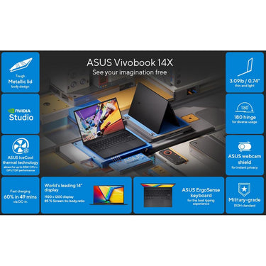 Vivobook 14X has the power to turn your ideas into creations faster than ever; thanks to its super-powerful 13th Gen Intel Core H-series processor and NVIDIA GeForce RTX 2050 Laptop GPU.
