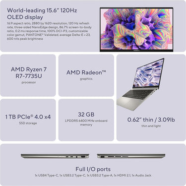 Zenbook 15 OLED is designed to perform; with the AMD Ryzen 7000 Series Processors with Radeon graphics; 32 GB of fast RAM; so you can blitz through any work or leisure task; wherever you are.