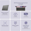 ASUS OLED laptops come with a best-in-class color gamut; it offers blur-free action scenes in movies and games; with smooth text scrolling. To keep your eyes comfortable and safe during the longest viewing sessions; the TÜV Rheinland certified display reduces the blue light emissions to minimize eye fatigue.