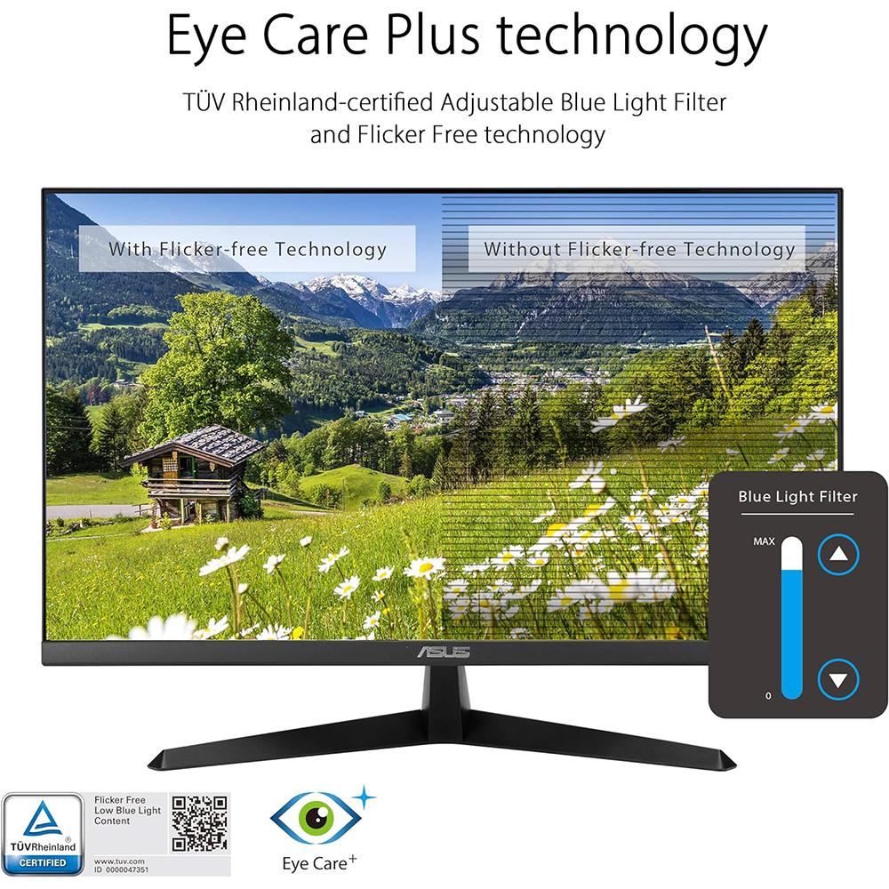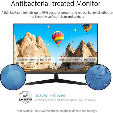 The 27 VY279HE monitor is equipped with ASUS BacGuard, an antibacterial ionic silver treatment applied on the midframe and hotkeys to inhibit 99% bacterial growth for a more sanitary surface. With Eye Care Plus, the VY279HE-W features additional color augmentation and rest reminder modes for a more user-friendly experience.
